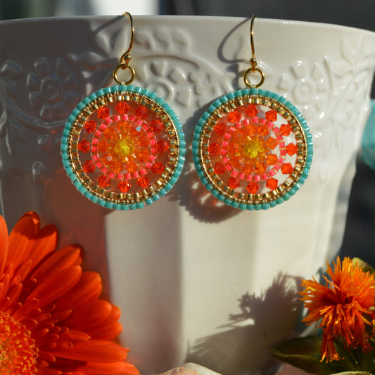 Earrings woven with Czech faceted glass bicones & crystals and Japanese seed beads exploring play of colourful glass and light shining through it. Magical beauty woven on sterling silver.