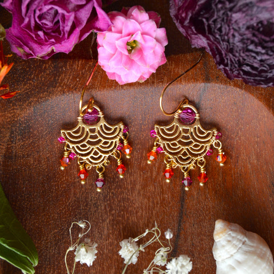 Gold-plated Sterling Silver Earrings Boho Chic - Waterfall - Cerise & Orange
