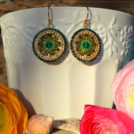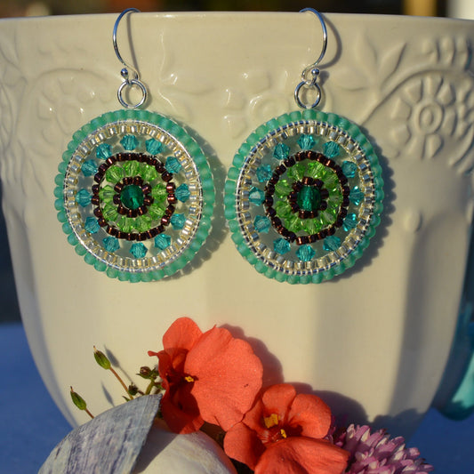 Sterling Silver Woven Czech Glass Earrings - Turquoise & Green