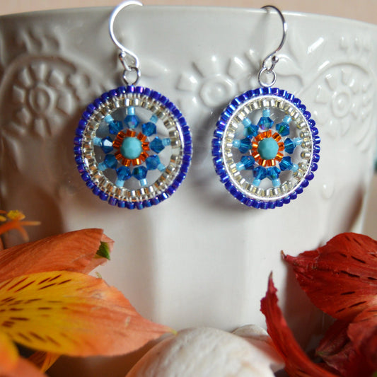 Sterling Silver Woven Czech Glass Earrings - Blue & Orange