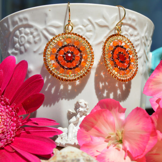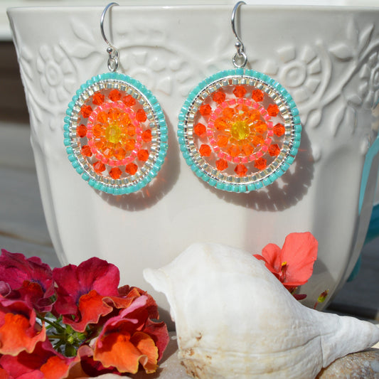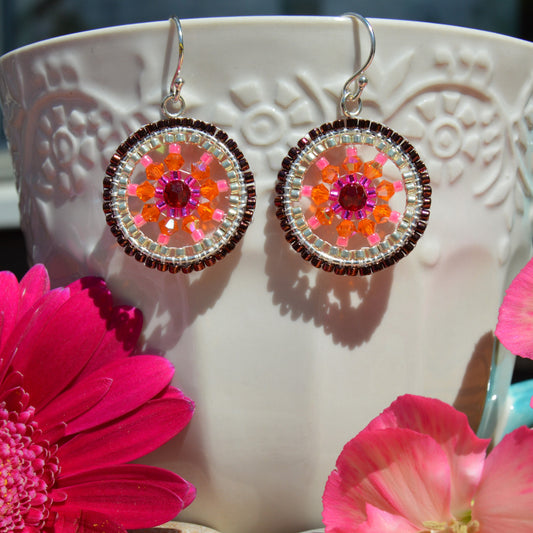 Sterling Silver Woven Czech Glass Earrings - Pink & Orange