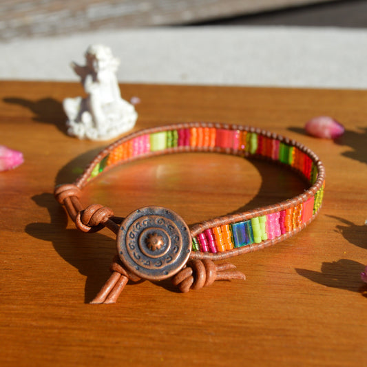 Boho Beaded Leather Wrap Bracelet - Colourful Neon