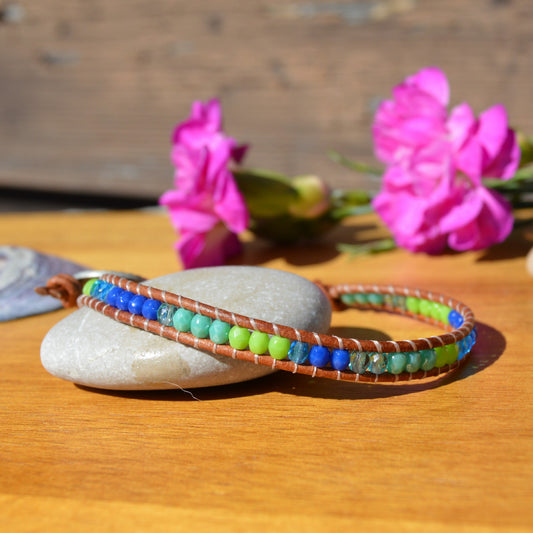 Boho Beaded Leather Wrap Bracelet - Green & Blue