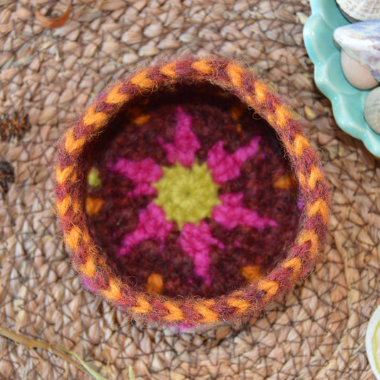 Small Crochet Basket - Embroidered Flowers - Bordeaux
